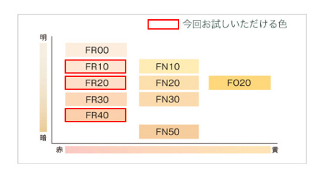 はじめは、標準色の「FR20」を基準に、それよりも明るめか暗めか、